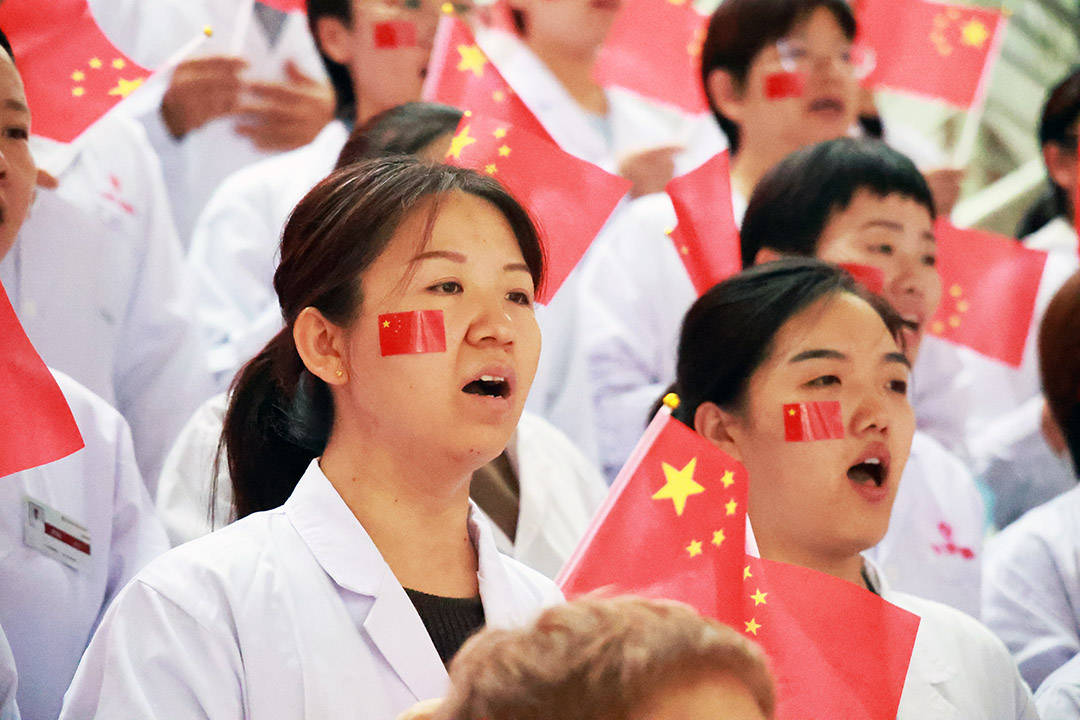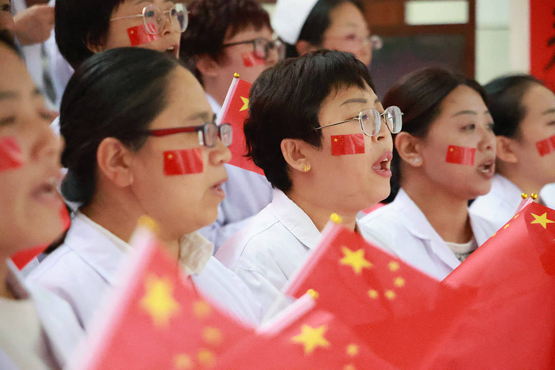 当《走向复兴》那激昂的旋律响起,全体医护人员瞬间肃然挺立,宛如一棵棵挺拔的青松。他们右手高擎国旗,仿佛在托举着祖国的希望与未来;左手轻抚心口,那是对祖国最真挚的承诺与忠诚。他们以整齐划一的动作,齐声唱响:“我们迎着初升的太阳,走在崭新的道路上……”嘹亮的歌声响彻楼宇,仿佛要冲破云霄,向世界展示着中国医务工作者的风采与力量。舞动的红旗与洁白的制服交相辉映,构成了一幅动人心魄、美轮美奂的画卷,让人不禁为之动容。