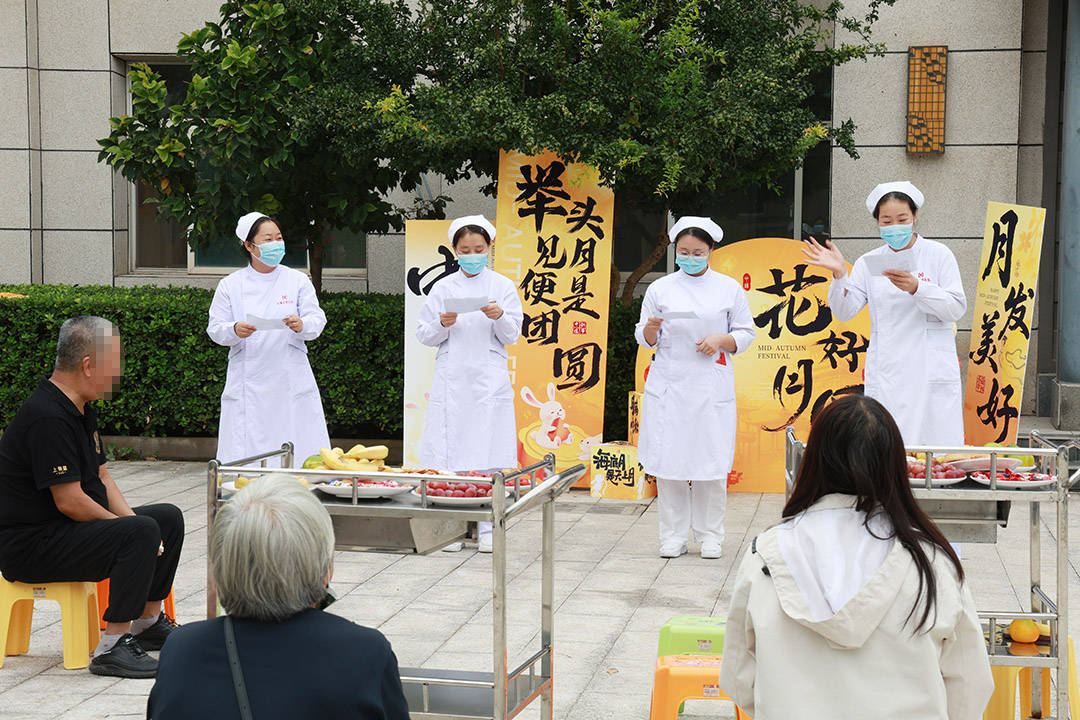 “举头望明月,低头思故乡……”结核病区的联欢会在医护人员集体朗诵的古诗中拉开帷幕。这场被患者称为“病房里的中秋诗会”的活动,以“沉浸式互动”为核心设计理念。护士团队自编的《拍手操》率先点燃现场气氛——患者们跟随轻快的节奏拍打手部穴位,在欢声笑语中完成肢体康复训练;随后,身着飘逸舞裙的护士们以一曲《向快乐出发》展现青春活力,灵动的舞姿与积极向上的歌词,让不少患者情不自禁跟着哼唱。